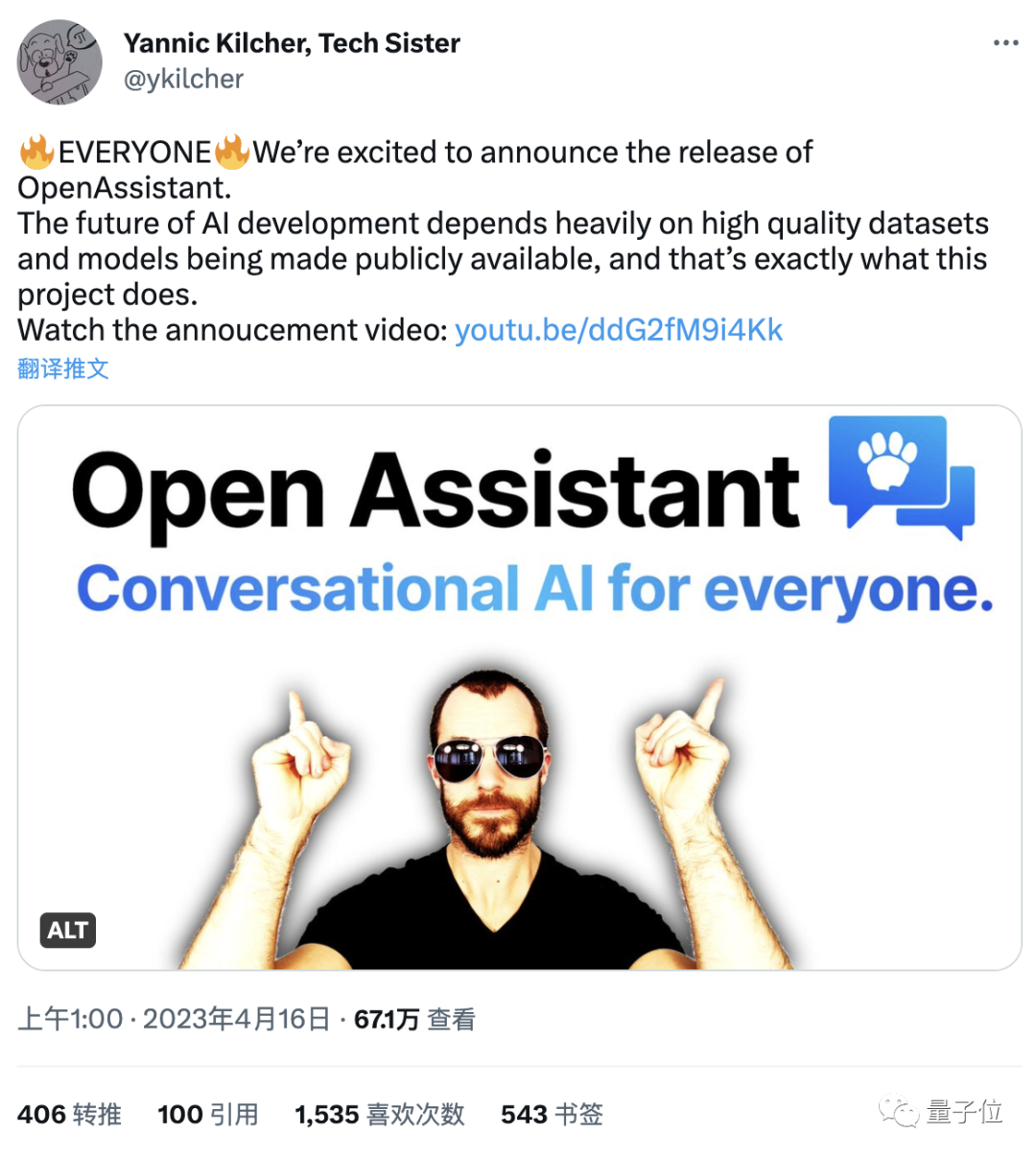 机器学习工程师兼科技博主Yannic Kilcher在社交媒体宣布了免费开源的AI助手Open Assistant发布的消息。