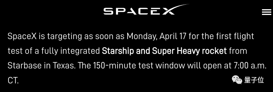 SpaceX官网发布通告称,其所研发的星舰(Starship)将于美国中部时间17日7时(北京时间20时)在德克萨斯州星际基地发射。