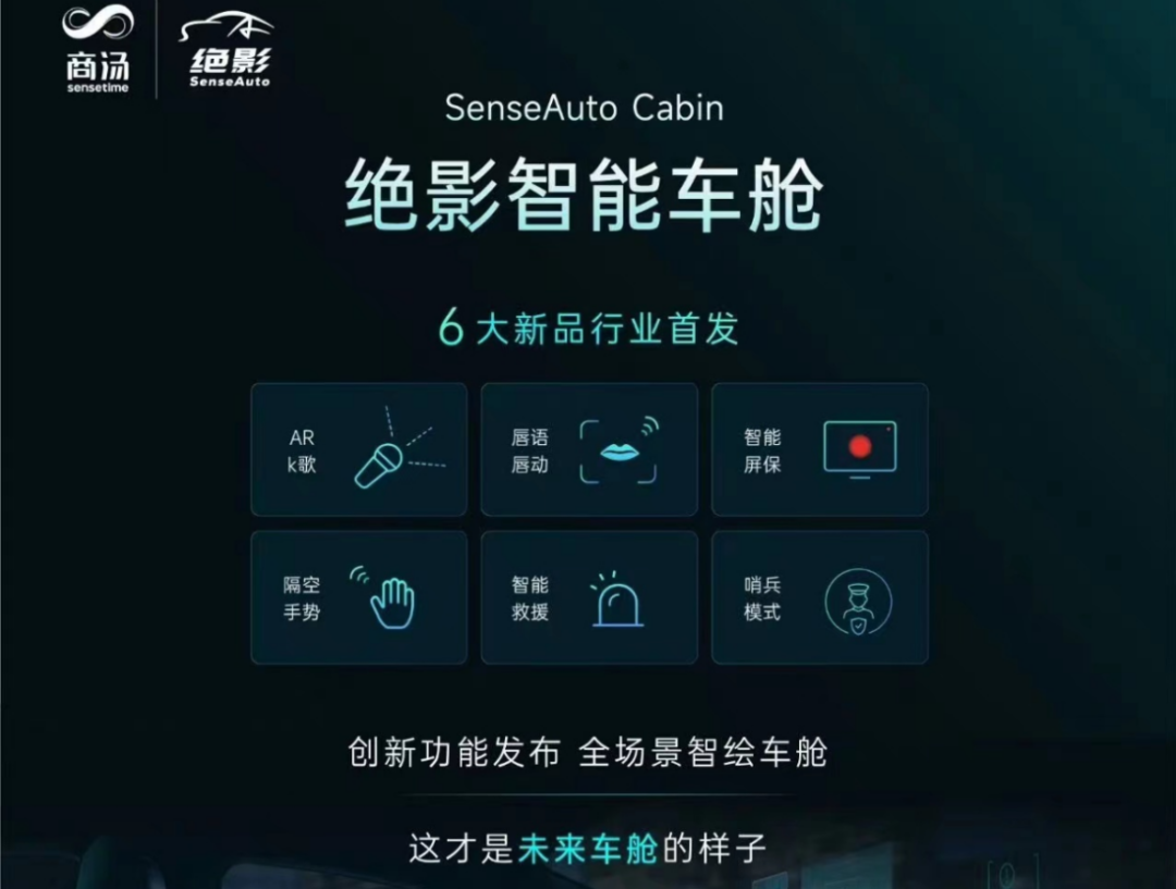 商汤的绝影智能车舱,由驾驶员感知系统(DMS)、车舱感知系统(OMS)、智能进入系统及车舱APP等产品组成。通过视线追踪、头部姿态、动作识别、物体识别技术实现无感进入、儿童感知、健康检测、智能相册、虚拟伴侣、AR小巴、管柱摄像头移动自标定等功能,在2023上海国际车展上,还会发布唇语唇动识别、哨兵模式、智能救援、Air Touch、AR K歌、智能屏保六大全新功能。