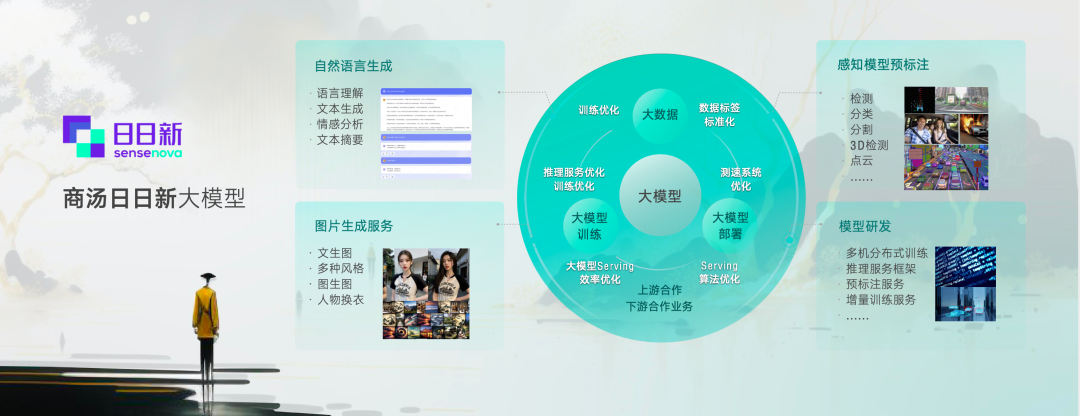 在4月10日发布的“商汤日日新SenseNova”大模型带来了全新的思路,徐立把它比喻成是一个“模型超市”,有数据、模型训练以及部署的三位一体的飞轮,能够完成自然语言的生成工具、图片生成的服务工具,所有的感知类任务的工具,以及模型的增量研发、服务工具。讲人话就是,这个商汤日日新SenseNova超大模型,可以自己产生越来越多大模型!