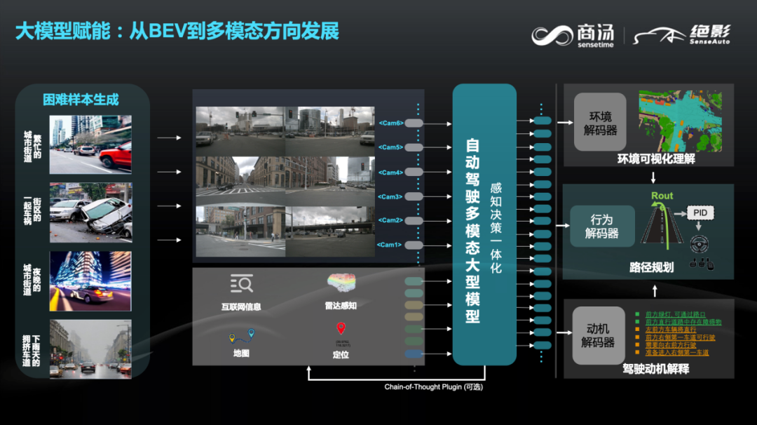而BEV也可以向多模态、通用人工智能的方向发展。通过商汤绝影的AIGC去生成困难的样本,给模型输入多模态的数据。