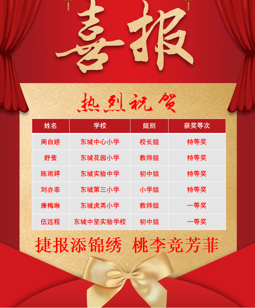 一份耕耘一份收获,在收获的背后,也凝结着指导老师们的辛勤付出。在本次赛事中,东城教育管理中心胡嵘苹老师、东城实验中学胡丹丹老师、东城第三小学吕小红老师、东城中坚实验学校刘锌老师也分别荣获“优秀指导老师”奖励。