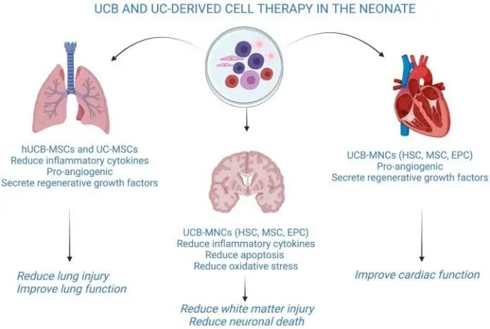 除了造血干细胞移植,脐带血衍生的细胞疗法在再生医学领域也越来越受到关注。用于再生医学应用的脐带血细胞并不参与植入,而是发挥旁分泌和免疫调节作用——特别是在抗炎,抗凋亡和促血管生成作用,这些影响是由脐带血中单个核细胞发挥作用,一类包括造血干细胞、调节性T细胞,内皮祖细胞、间充质干细胞、免疫细胞的细胞类群。由于上述细胞在抗炎、促血管生成和抗凋亡特性,脐带血在新生儿领域显示出希望,如缺氧缺血性脑病、支气管肺发育不良和早产脑部炎症,目前已进入到临床试验。