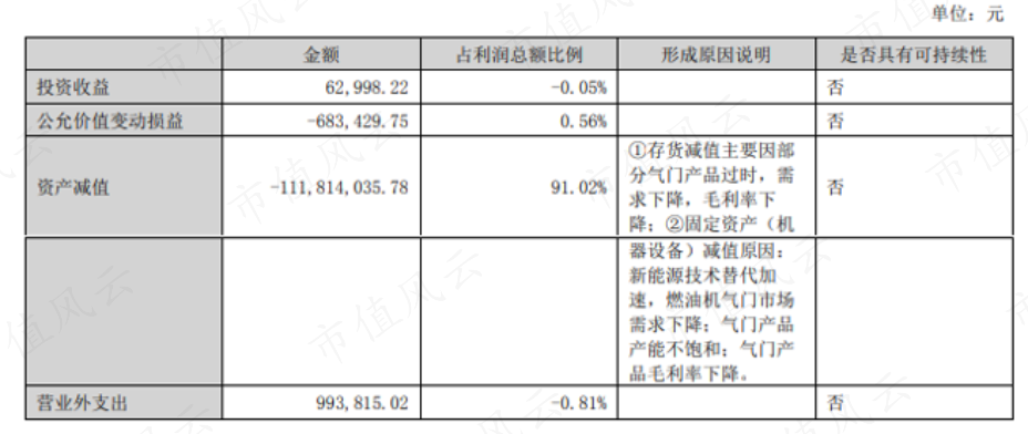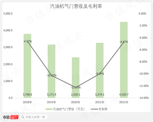 值得一提的是,近年来,主营业务中汽油机气门的毛利率常年为负,2022年为-4.7%,但同期营收规模却同比大增38.1%。