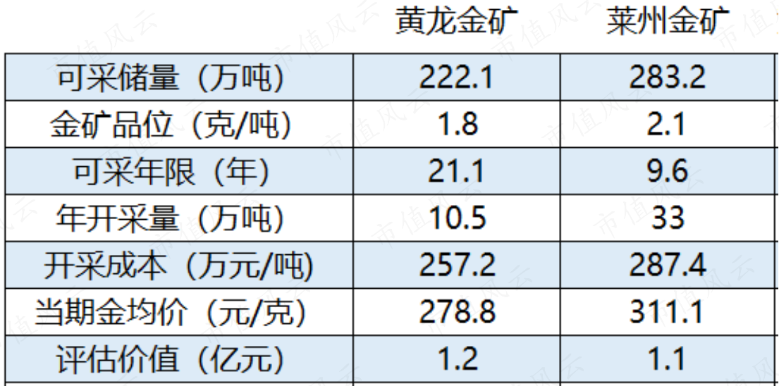 可以看到,山东黄金收购的莱州金矿除了开采成本和年限较高之外,可采储量、年开采量、金矿品位、估值时的金价均高于黄龙金矿,但黄龙金矿的估值却更高。