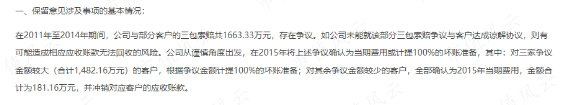2015年,信永中和会计师事务所对公司的年报出具了保留意见,原因是2011-14年期间,公司与部分客户的三包索赔共1,663.3万元,2015年一次性计提了减值或费用。
