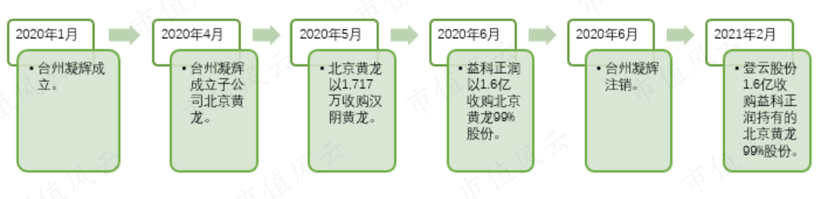 2020年6月,登云股份及其母公司益科正润分别以165万、1.6亿,收购了北京黄龙1%、99%的股权。2021年2月,公司又从益科正润手中以1.6亿买走了北京黄龙剩下的99%股权。