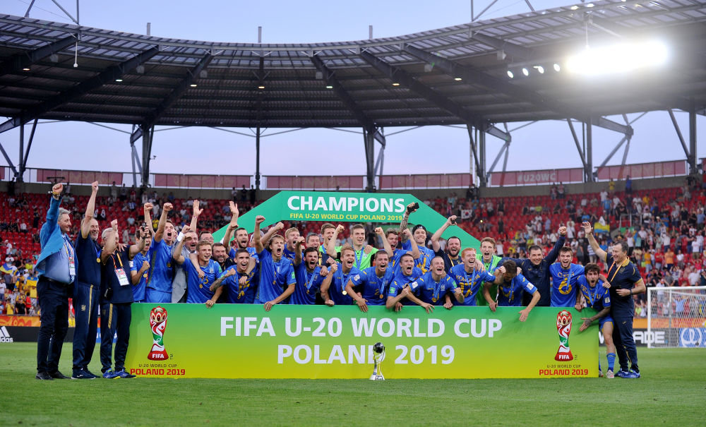 资料照片:乌克兰队球员在波兰罗兹举行的国际足联U20世界杯决赛夺冠后庆祝(2019年6月15日摄)。新华社发(拉法尔·鲁塞克摄)