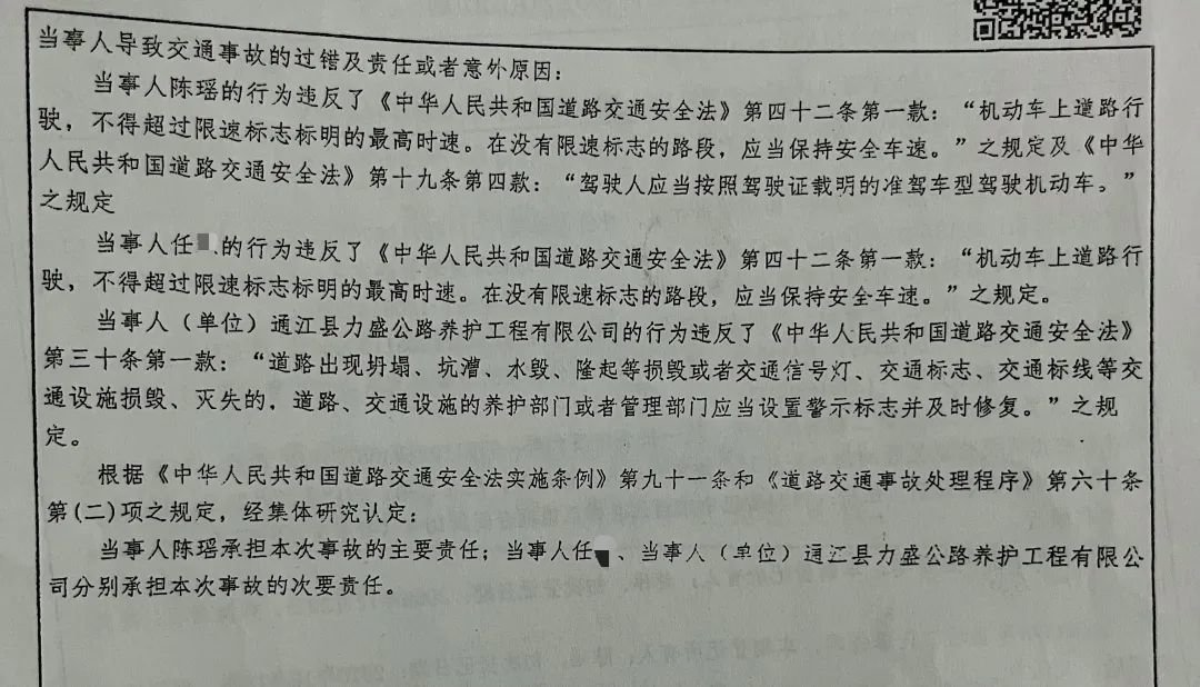 通江县公安局交管大队作出的《道路交通事故认定书》显示,警方认为,仅持有C1驾照的陈瑶(准驾车型不符)没有保持安全车速,承担主要责任;任某没有保持安全车速,承担次要责任;通江县力盛公路养护工程有限公司(下称力盛公司)未设置警示标志并及时修复,承担次要责任。