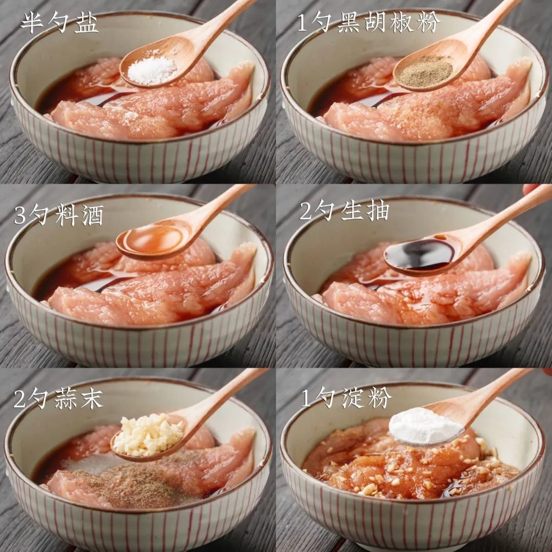 2、鸡胸肉中加入半勺盐、1勺黑胡椒粉、3勺料酒、2勺生抽、2勺蒜末、1勺淀粉(淀粉是为了让肉更嫩,如果你是严格控可不加)搅拌均匀,腌制30分钟使其充分吸收。