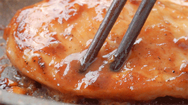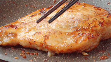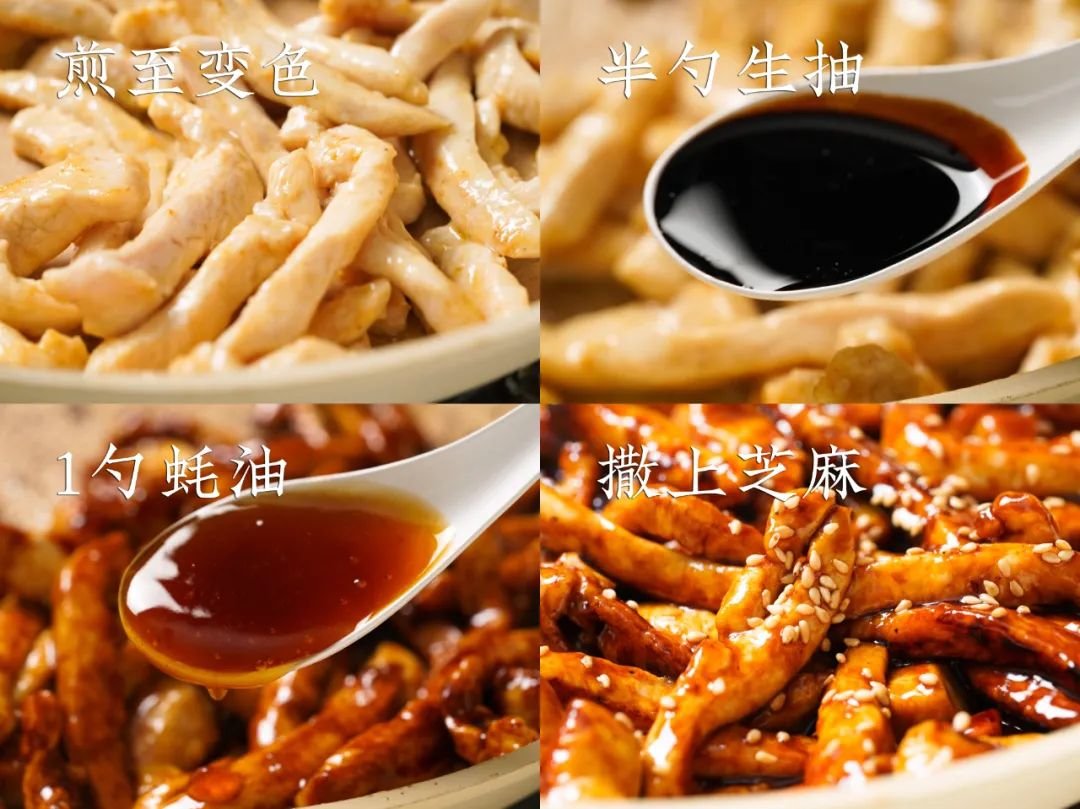 3、将鸡胸肉中火煎至变色后加入1勺蚝油、半勺生抽,煮至汤汁粘稠后撒上芝麻。