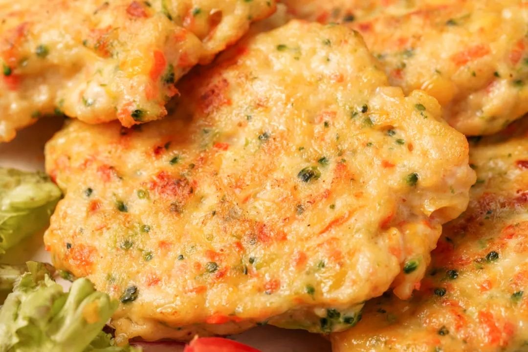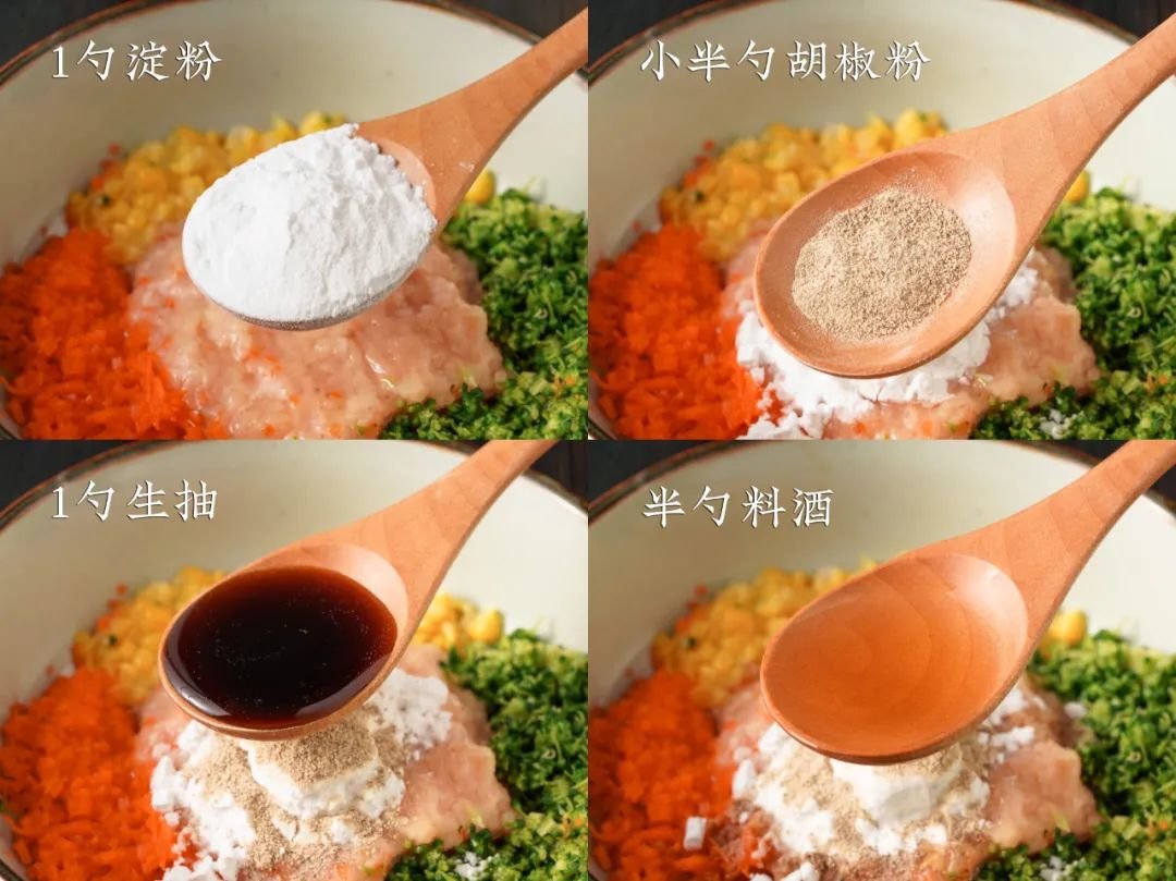 1、120g鸡胸肉剁泥+20g西兰花碎+20g玉米粒+20g胡萝卜碎+1勺淀粉+小半勺胡椒粉+半勺料酒+1勺生抽,搅匀,再加1个鸡蛋拌匀,搓成一个个鸡肉丸(稍后会压扁)。