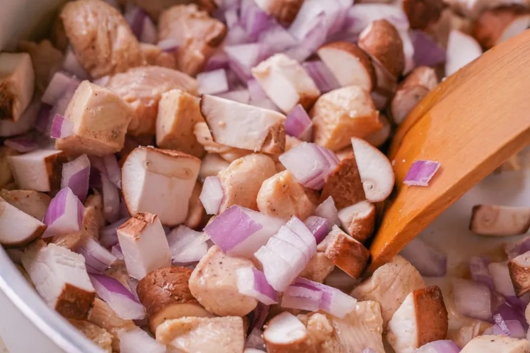 2、锅中倒入腌制好的鸡胸肉,中火煸炒至变色,加入香菇丁和洋葱继续翻炒3分钟。