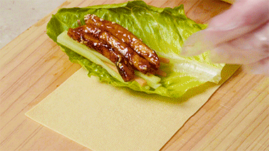 4、卷法可按个人喜好。一般取一片百叶垫上生菜叶子,依次加上胡萝卜、黄瓜、鸡胸肉卷起即可。