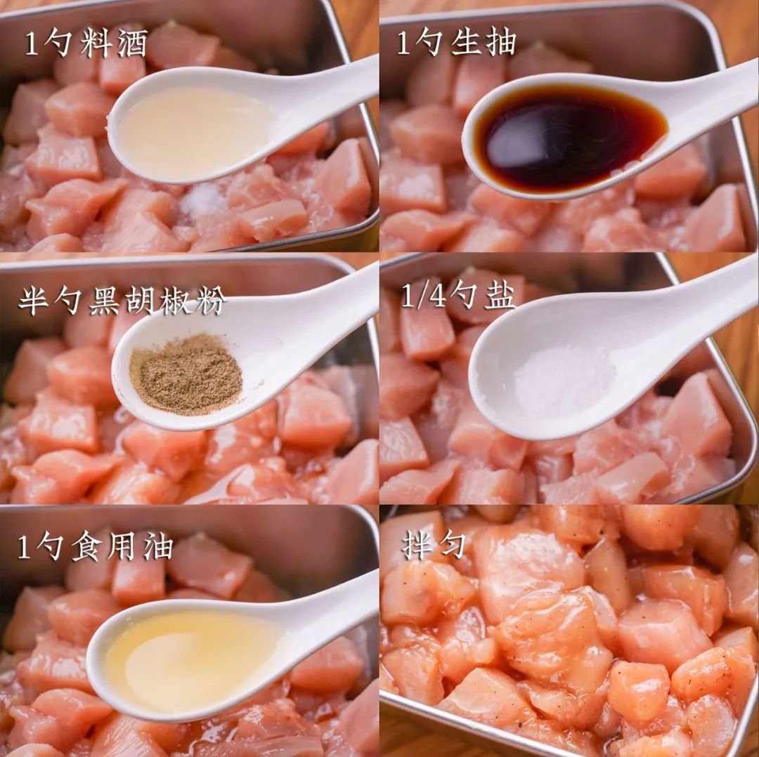 1、250g鸡胸肉和5个香菇切成1*1cm的正方形小块,半个洋葱切丁。鸡胸肉中加入1勺料酒、1勺生抽、半勺黑胡椒粉、1/4勺食用盐和1勺食用油,抓拌均匀,腌制10分钟。