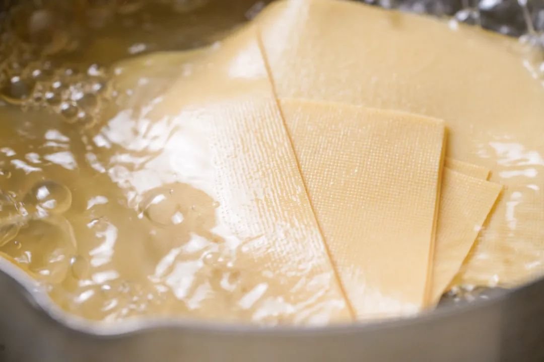 1、锅中放入10张切成大约长8cm宽5cm长方形的百叶,加入200ml清水,大火煮开后将百叶捞出。