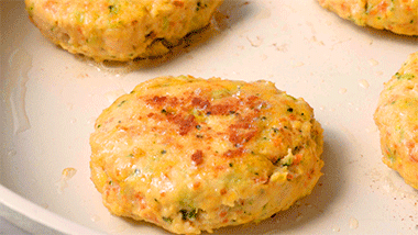 2、平底锅薄薄的刷层橄榄油,中小火烧至锅热(一定要够热才会外脆里软),把鸡肉蔬菜丸下锅后,听着滋拉声,用铲子轻轻压扁,煎3分钟翻面再煎3分钟,两面金黄。