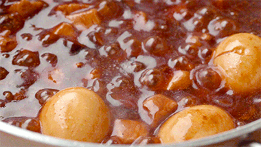 3、加入1勺生抽、1勺老抽、1勺蚝油、1勺冰糖和500ml清水,大火煮开后转小火,放入2个去壳的白煮蛋,焖煮15分钟后开盖,大火收汁至汤汁粘稠(约2分钟)。