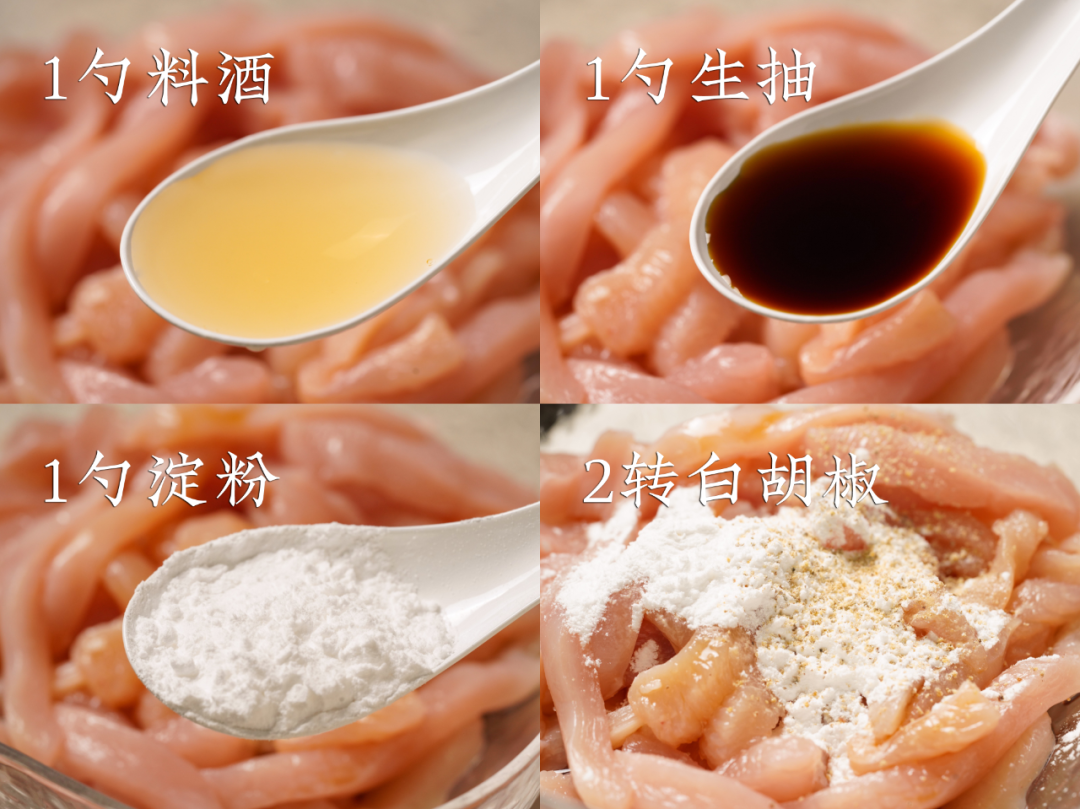 2、鸡胸肉切条备用。1根黄瓜和1根胡萝卜各切成5cm长的细条备用。鸡胸肉中加入1勺料酒、1勺生抽、1勺淀粉和2转白胡椒,腌制半小时。