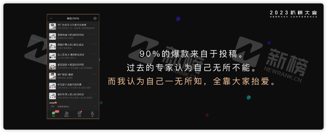 要做成这样一种氛围,其实非常艰难,我们要对抗的是别人告诉你的东西,尤其是你突然又看到新榜发了一篇文章说一个月涨了1000万粉,这个人是怎么做到白手起家的,说微信自媒体很快就淘汰了,你们要all in,我们不要被PUA,同时也不要PUA别人,开大会也不要散播焦虑、传递快乐,我现在讲的你们听得很快乐就来点掌声。
