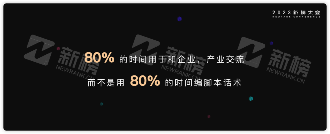 我们找到了企业八大特定精众场景,我们做的事情是解决企业重要信息无法有效传递的核心痛点。同时我所认为的品类是深度有原创,因为自己也做企业咨询,所以我们不认为要花80%的时间编脚本和话术,要花80%的时间用于和企业、产业交流,只能做你能做的群体,因为我们的效率结构不一样。