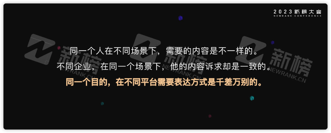 这个时候我有了很多全新的思考:同一个人在不同场景下,需要的内容是不一样的;不同的企业在同一个场景下,他的内容诉求却是一致的。同一个目的,在不同的平台需要表达的方式是千差万别的。为什么过去总是说做微博的很难穿越到做微信,做微信长文章的很难穿越到做视频,是因为有内在逻辑的区别。看文章的场景,和刷视频的场景,和刷竖屏、横屏完全是不一样的内心诉求。