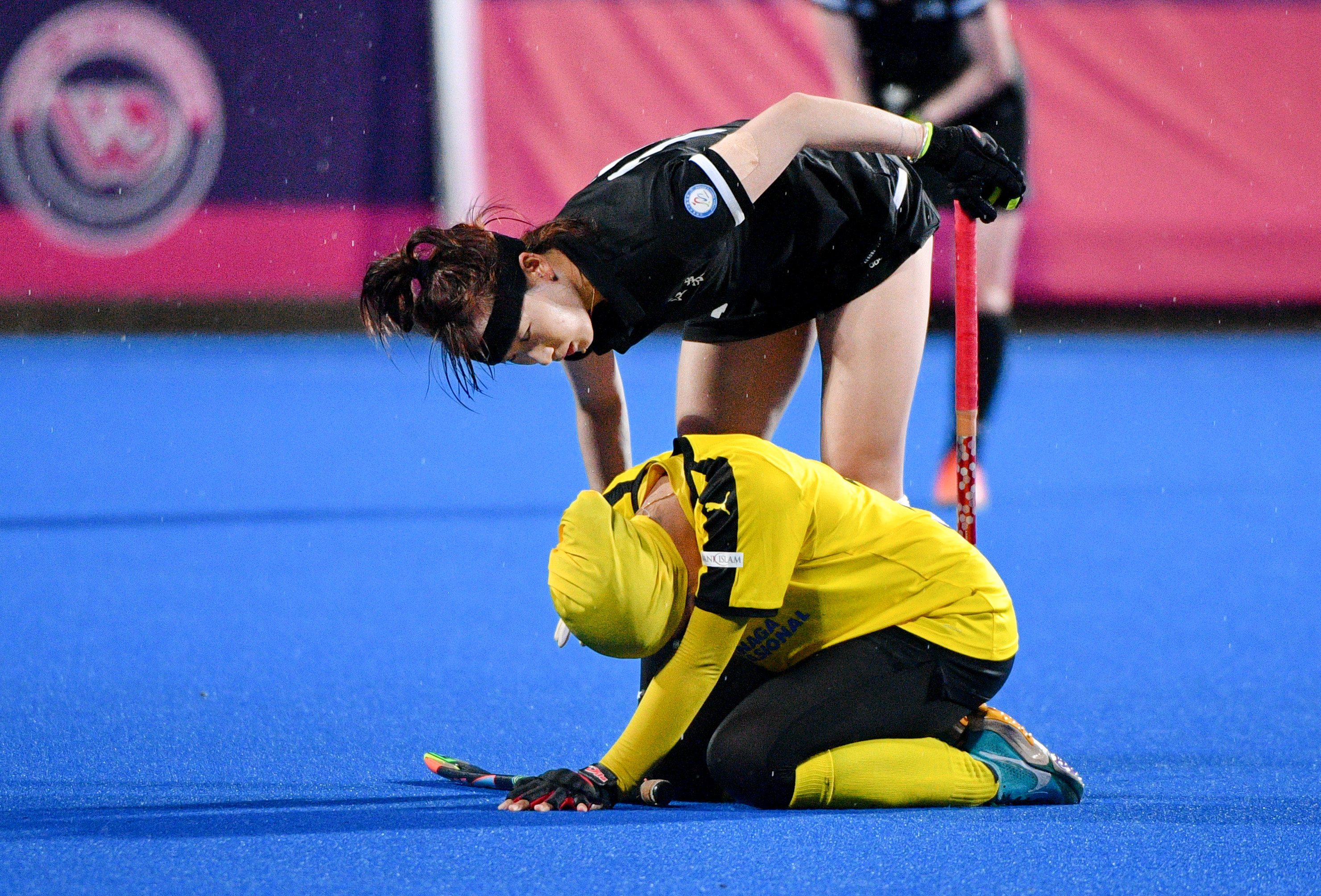 4月18日,江苏队球员屠一丹(上)在比赛中安慰受伤倒地的马来西亚队球员。新华社发(史康摄)