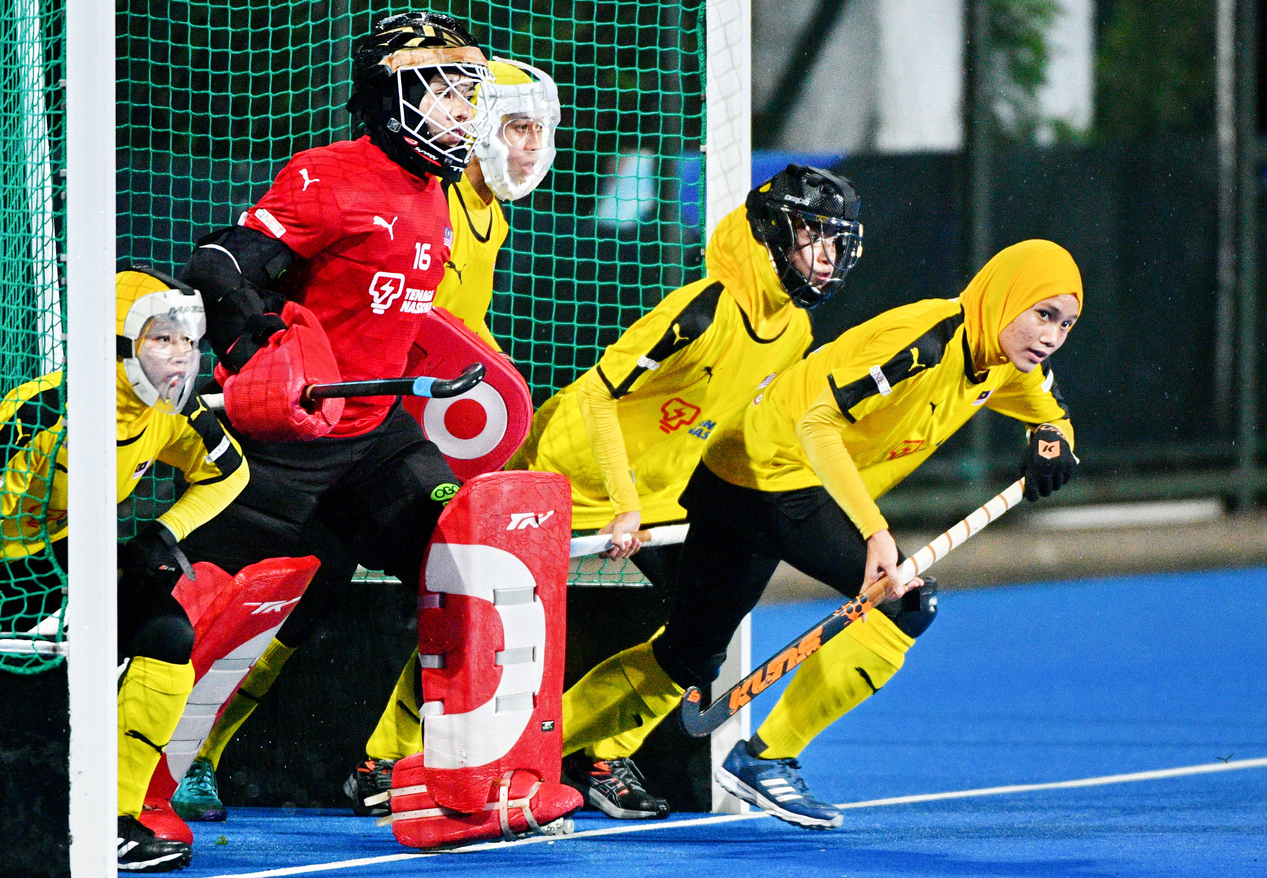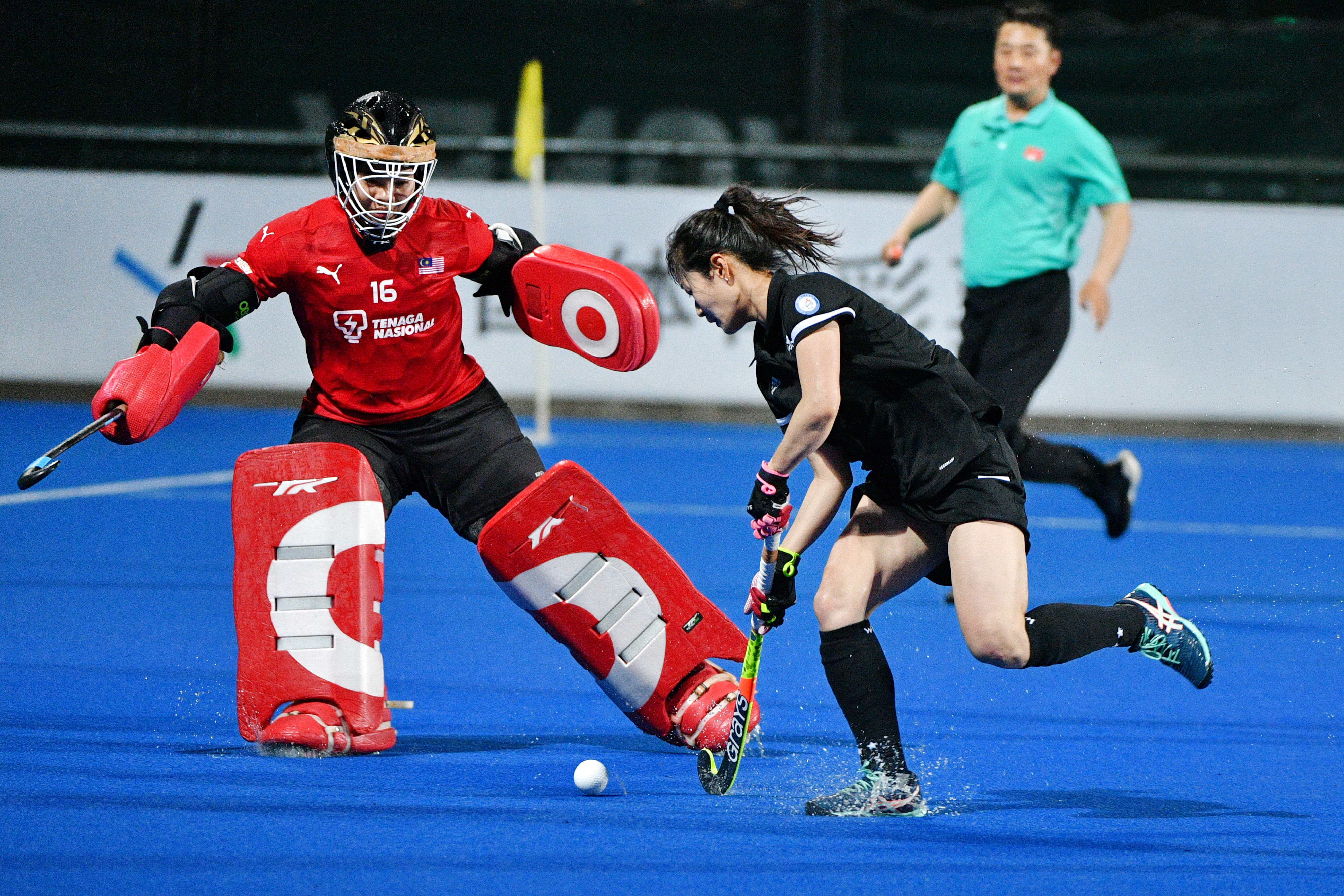4月18日,马来西亚队球员在比赛中防守短角球。新华社发(史康摄)