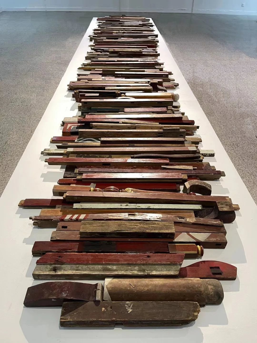 傅中望的《漆木遗存》由本世纪前后的若干件刷漆的老家具部件构成,他以此对历史记忆和日常生活进行了反思。傅中望在这件作品中使用了挪用现成品的创作手法,反映出当代艺术不断地把非艺术的对象纳入艺术的范畴。