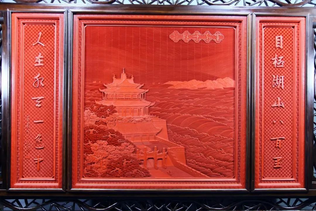 ▲ 文乾刚《剔红“春和景明”三扇中堂挂屏》 图片来源:湖北美术馆
