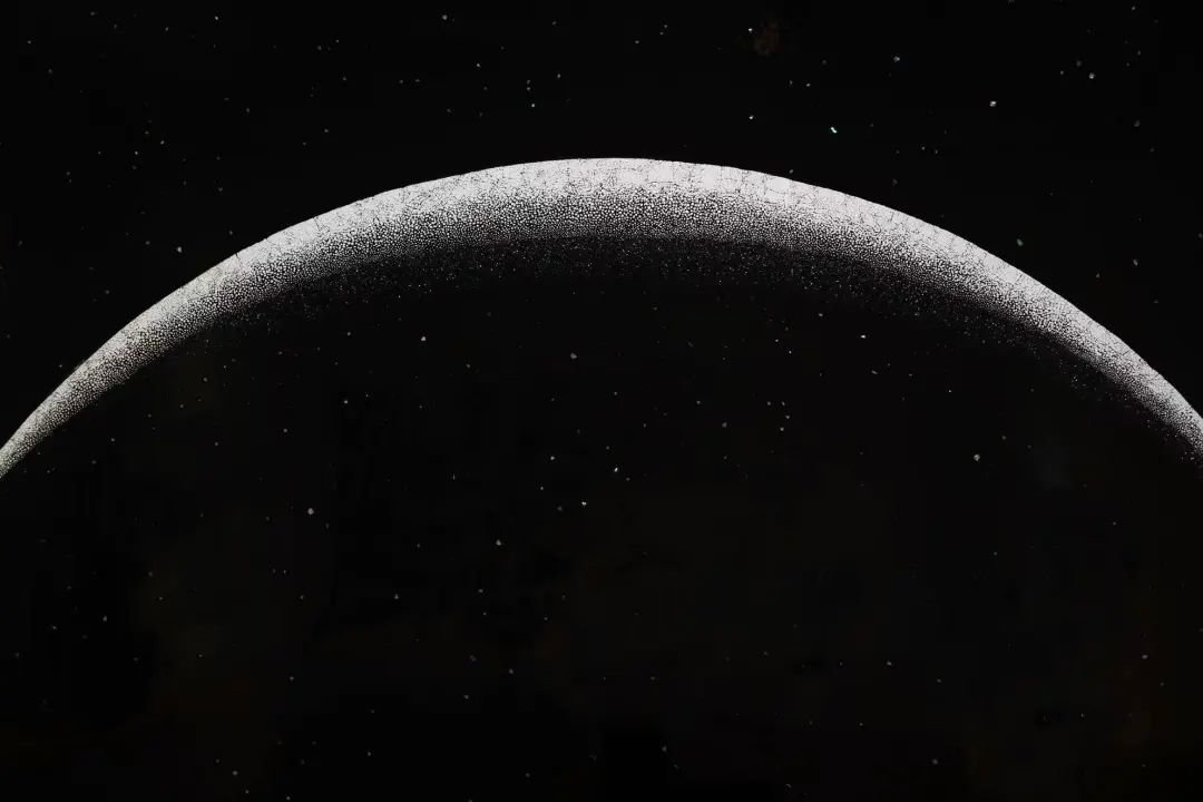 与《风衣》相邻的展墙,悬挂着乔十光以大漆与蛋壳创作的《苍穹之五》。在这幅作品中,细碎的蛋壳组成为了浩瀚宇宙中的光,让漆黑而神秘的世界得以显形。乔十光曾说:“人太渺小,宇宙太博大,而漆就像宇宙一样,等待着人去探索,而我只是先行一步。”