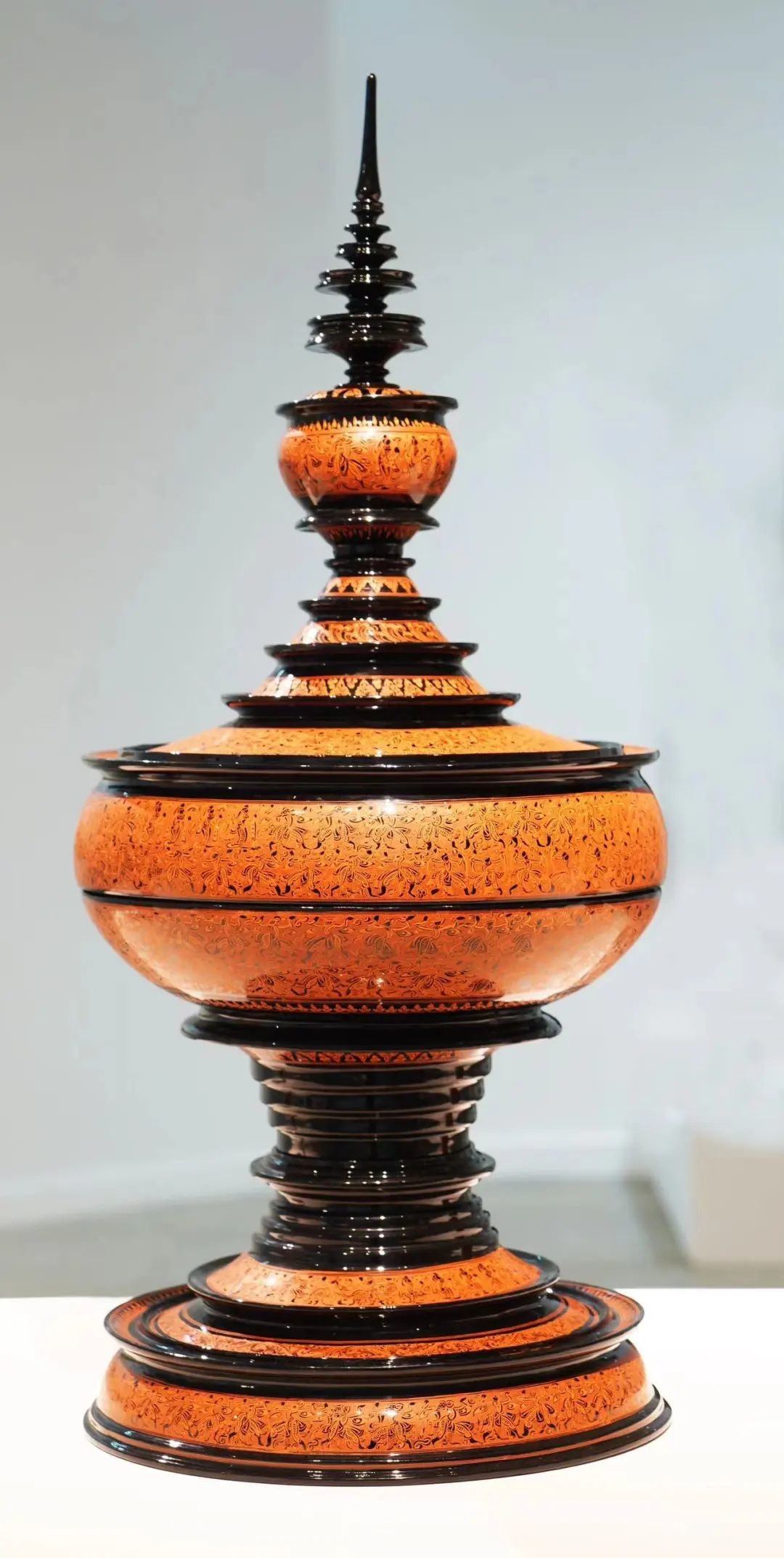 展览中还可以看到甘而可的《红金斑犀皮漆提梁盒》与文乾刚的《剔红“春和景明”三扇中堂挂屏》,这两件作品完整地展现了传统漆器的工艺水平。而在第一板块还展示了来自泰国、越南、缅甸的传统漆器作品,东亚语境下的各国漆器对读也给观者带来了不同的体验。