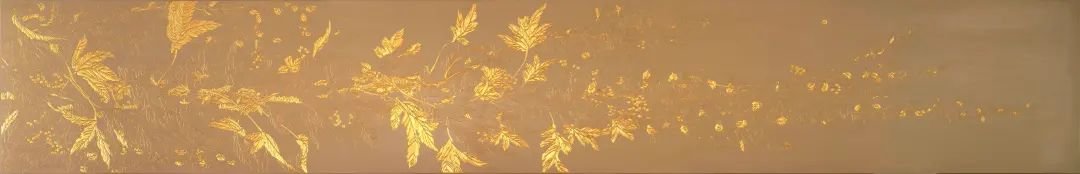 林怡的《红丝草》在传统戗金款彩工艺的基础上,采用阴刻线条和阳刻起底相结合的形式,将苏州工作室外爬山虎那种涌动的生命力表现得入木三分。而策展人曾静将这件原本竖幅展示的作品横置,则带来了一种飘逸而灵动的视觉效果。