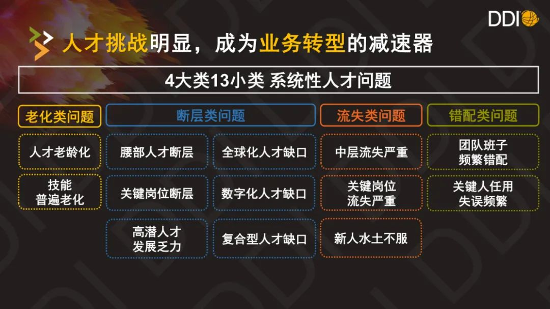 一旦业务现状与人才战略无法相匹配,长此以往就会产生问题。当我们点状地来看这些问题,就往往会发现东边缺一个人,西边少一个人。而DDI根据多年来的实践经验,提炼发现企业往往都会陷入以下常见的4大类、13小类系统性的人才挑战(见下图)。