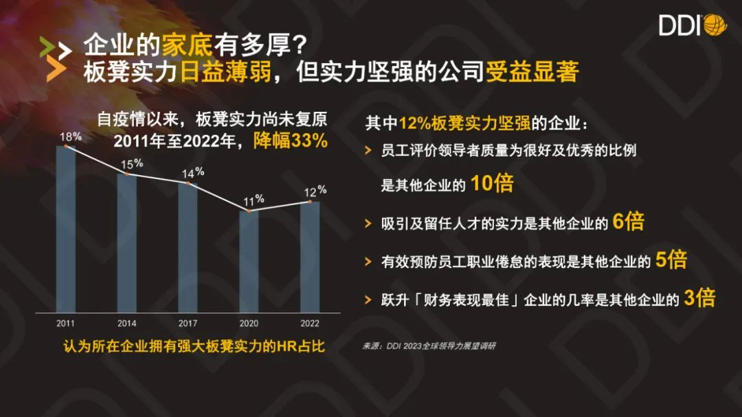 根据DDI“2023全球领导力展望”调研的数据,仅有12%的企业认为自身板凳实力足以支持企业未来的业务成长。而板凳实力坚强的企业,无论是领导者的质量,还是吸引及留任人才的实力,甚至财务表现,都远远领先于其他企业。