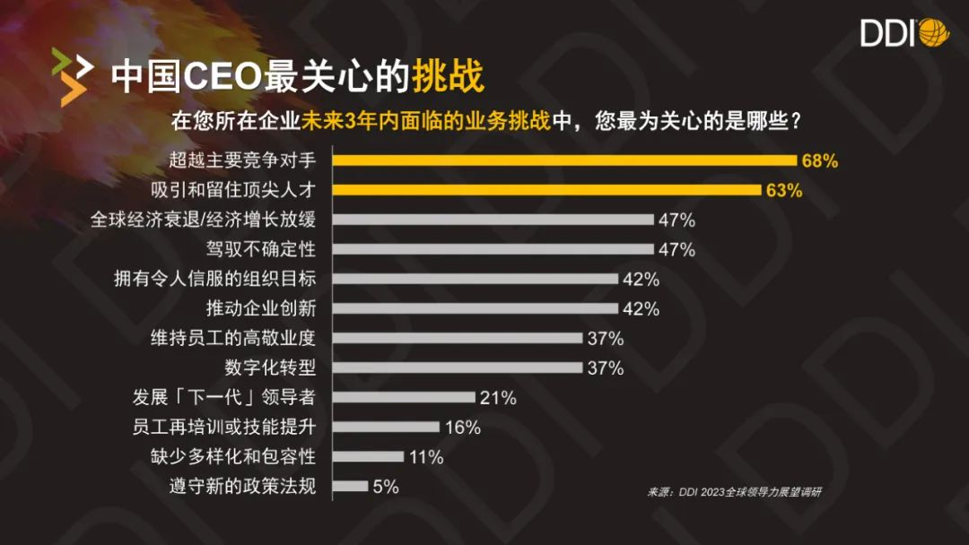 最近,DDI做了“2023全球领导力展望”调研,数据显示,后疫情时代的中国CEO们最为关心的两大挑战,排名第一的是“超越主要竞争对手”。这一挑战上次排行还是第三,可见大环境不佳的情况下,竞争加剧、内卷明显;第二个挑战是“吸引和留住顶尖人才”,这个问题的焦虑程度从2022年的57%提升到63%。