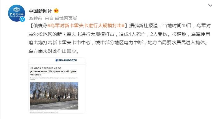 据俄新社报道,当地时间19日,乌军对赫尔松地区的新卡霍夫卡进行大规模打击,造成1人死亡,2人受伤。报道称,乌军使用迫击炮打击新卡霍夫卡市中心,城市部分地区电力中断,地方当局要求居民进入掩体。乌方尚未对此作出回应。