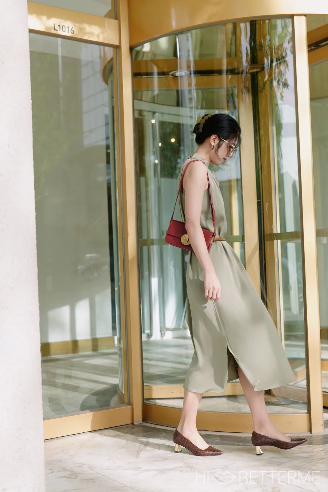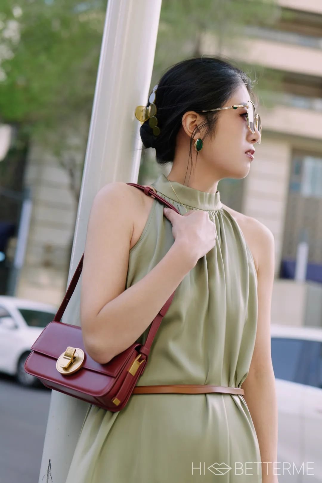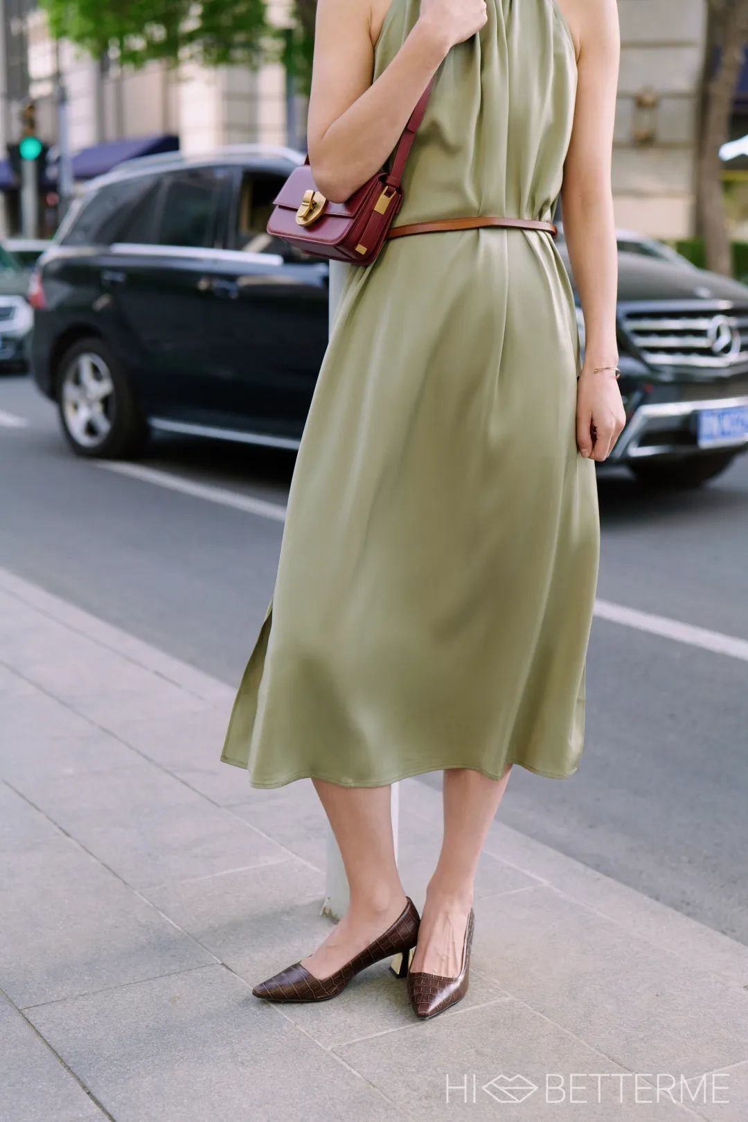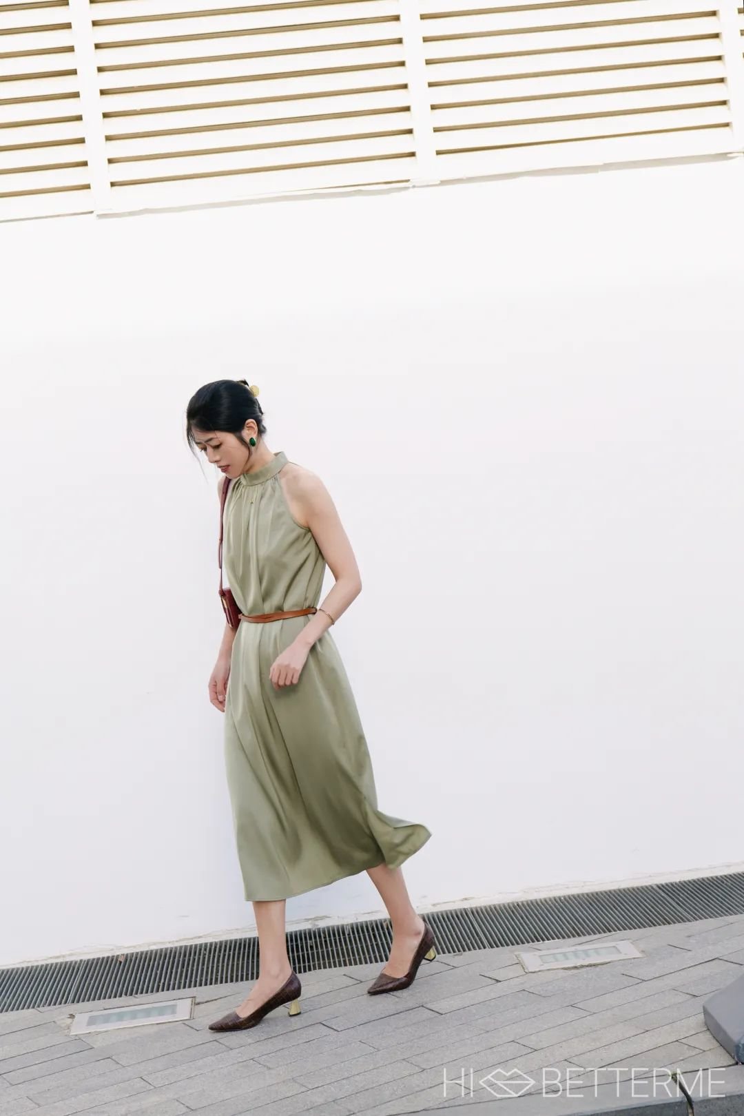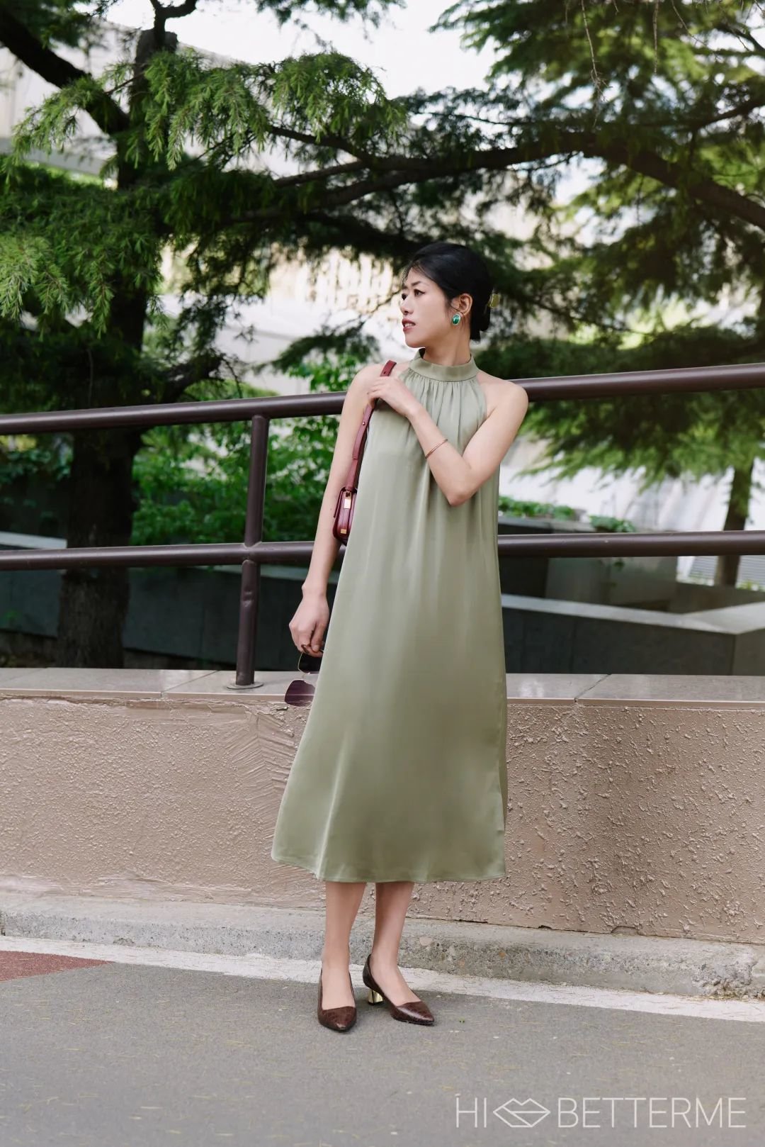 如果想美得低调一点,也可以选一只卡其色的手包来搭,一样得体出彩~