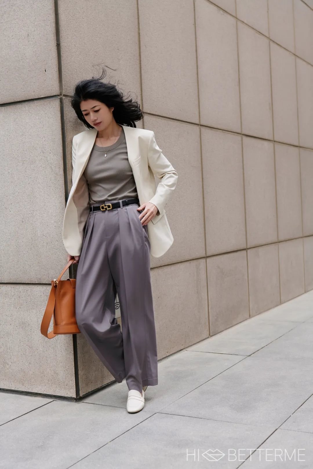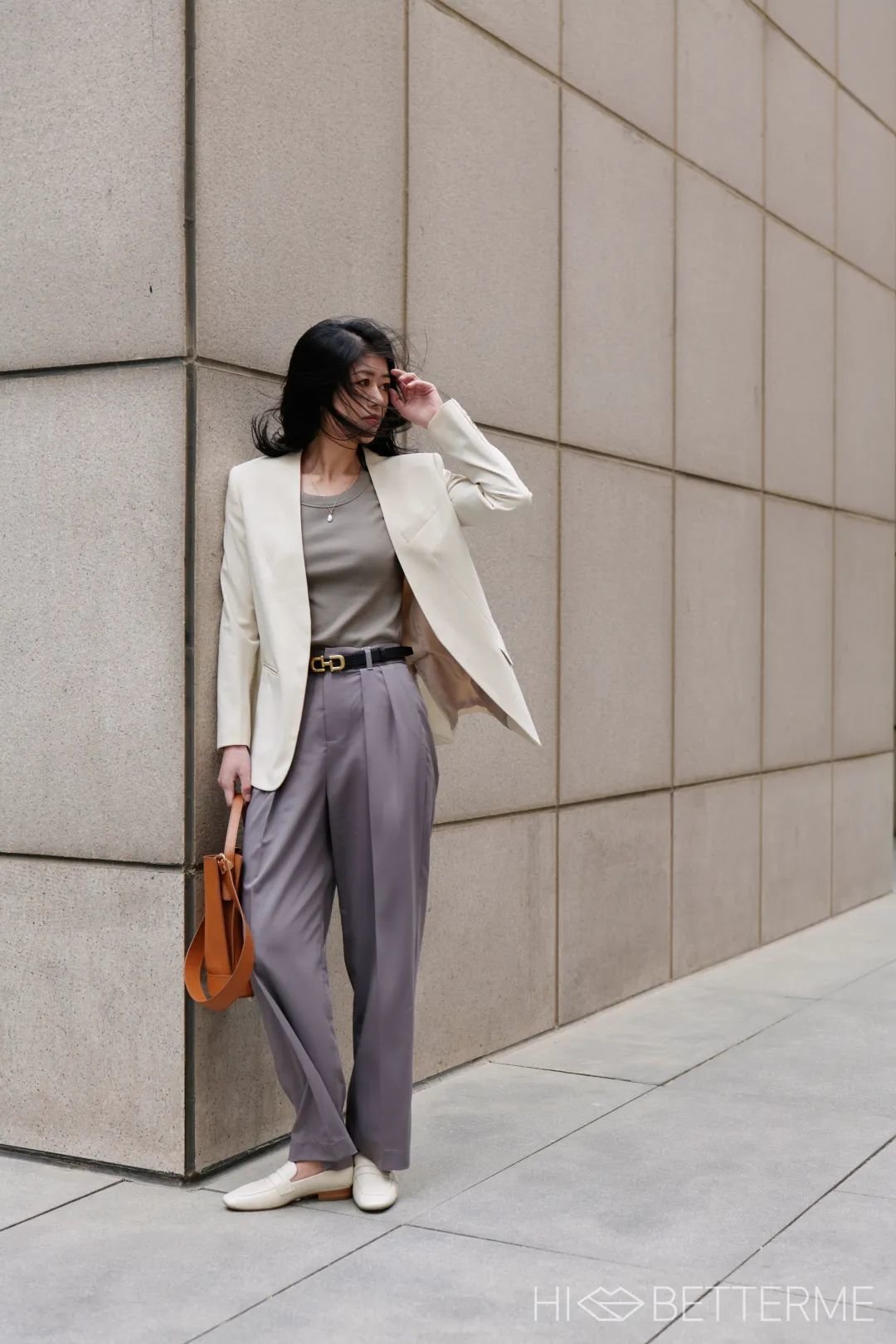 为了给全身清淡色突出比例,我还加了条腰带明确高腰线,好比例信手拈来!