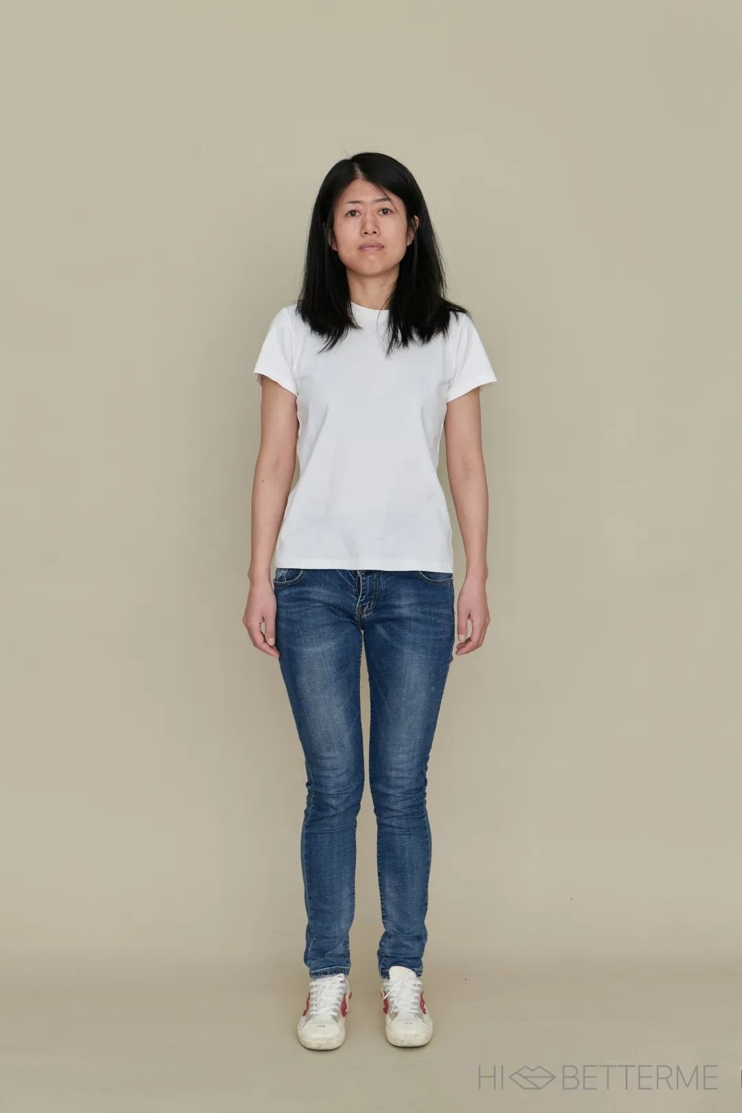 从整体来看,她的的身材胯部和腰部的宽度相近,算是比较明显的 H 型身材。