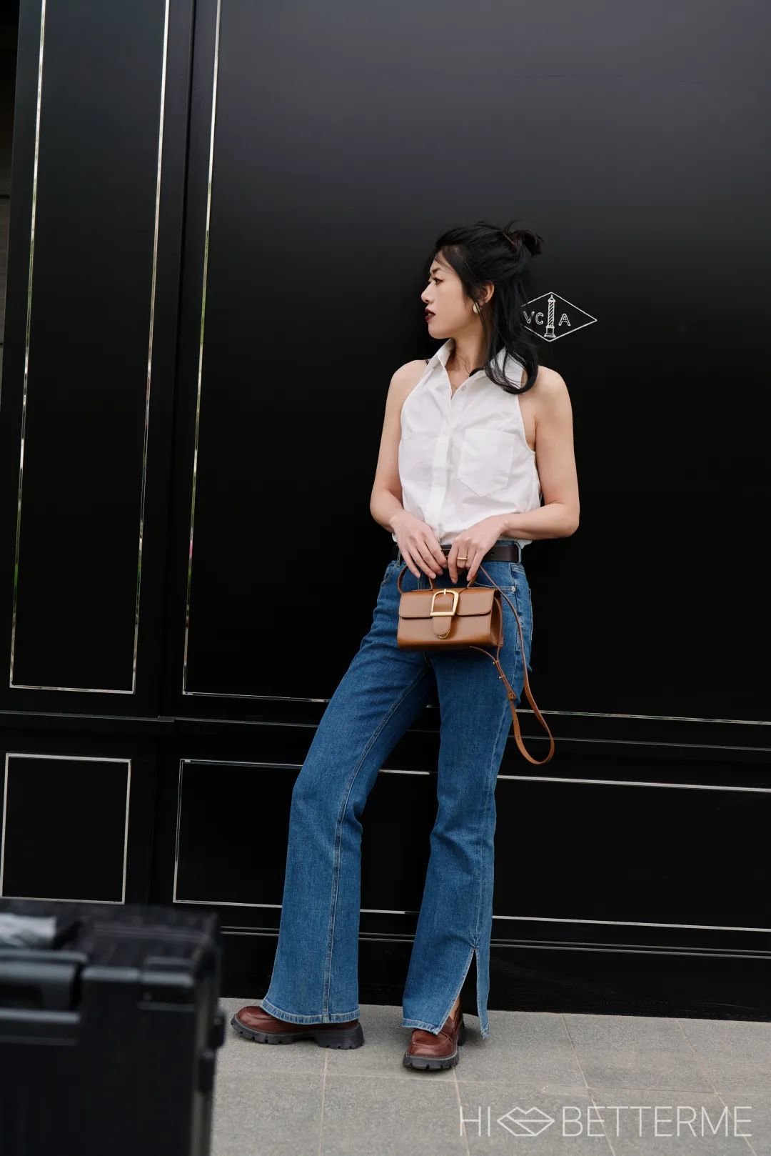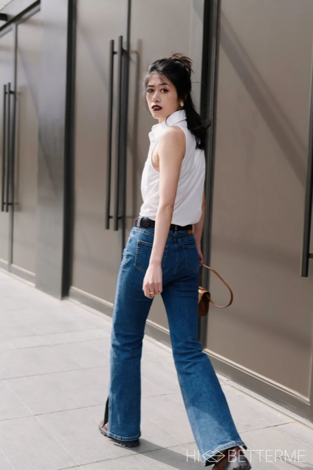 考虑到阿芋的腰臀比比较小,X 型的腿形也需要一些小修饰,所以高腰喇叭裤就成了最好的选择。