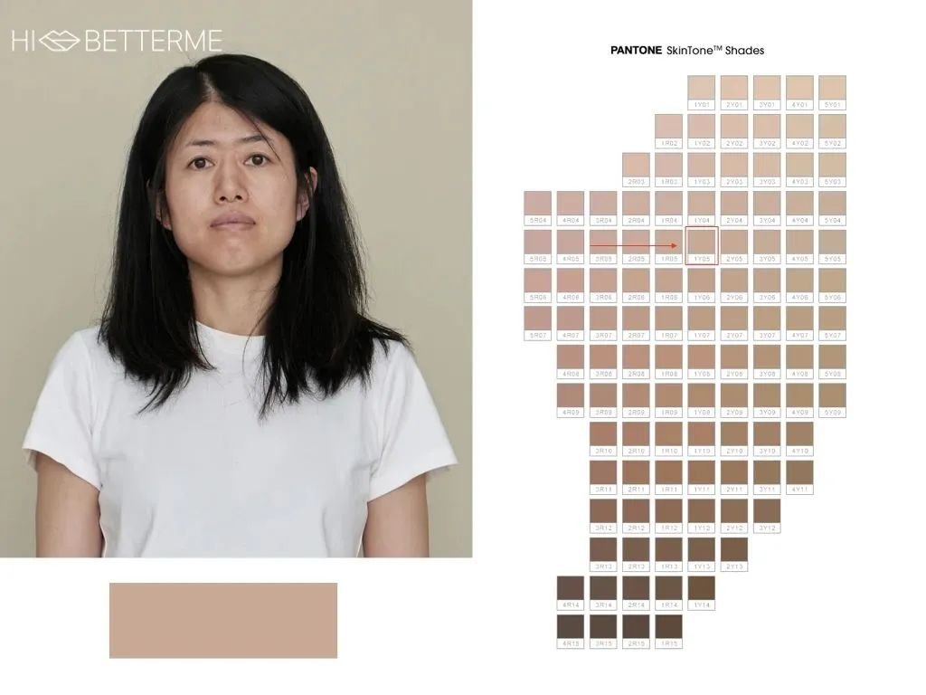 阿芋的皮肤肉眼看是黄偏点黑,类似于色号 4Y05,属于黄皮里偏冷的橄榄皮。