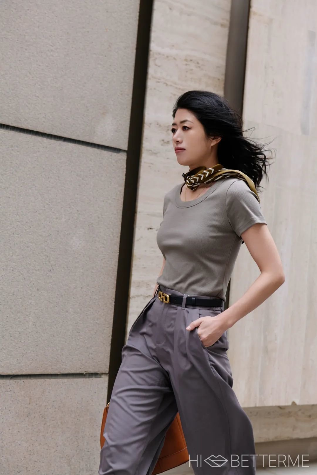下身选了条烟灰色高腰长裤,软而有型,上班穿很提气。