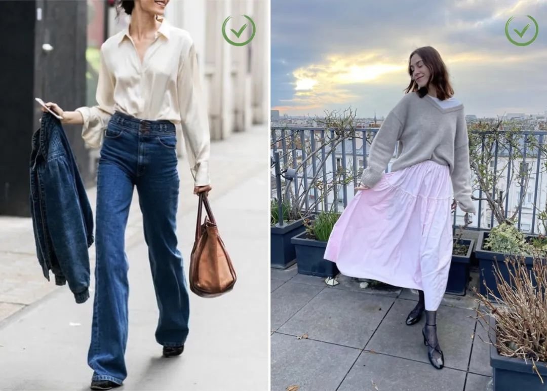 可以用「上紧下松」的穿法,通过宽度差来塑造曲线,也就是俗称的「捏个腰」。