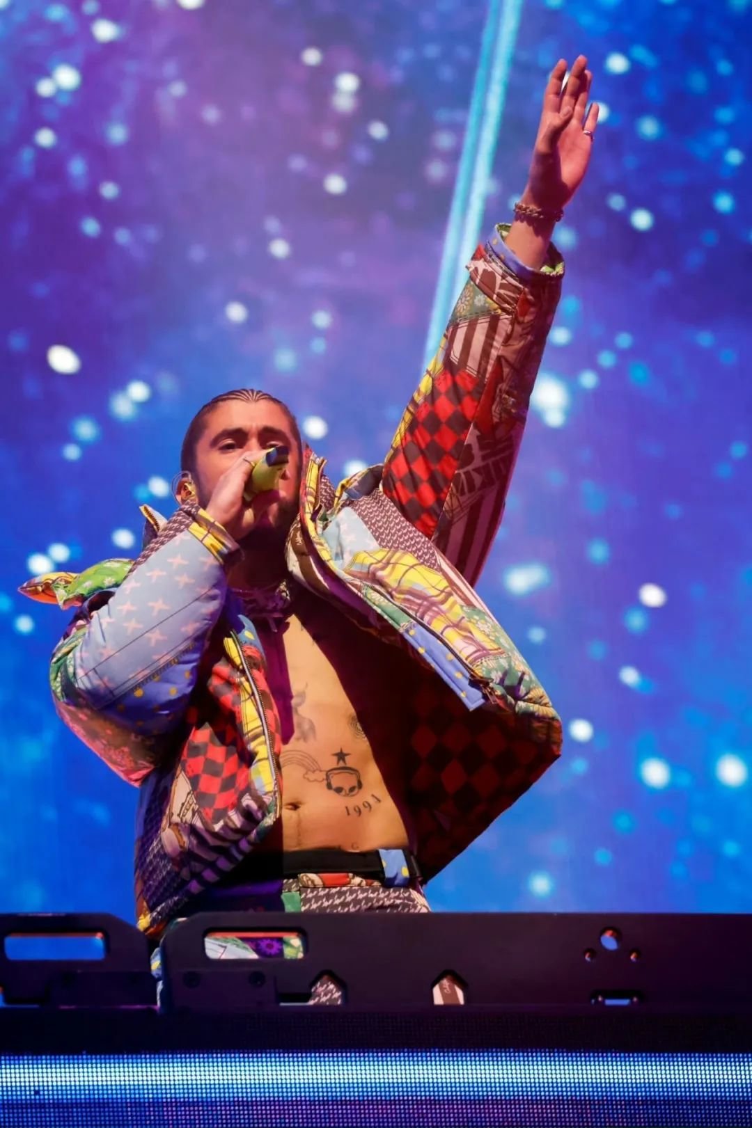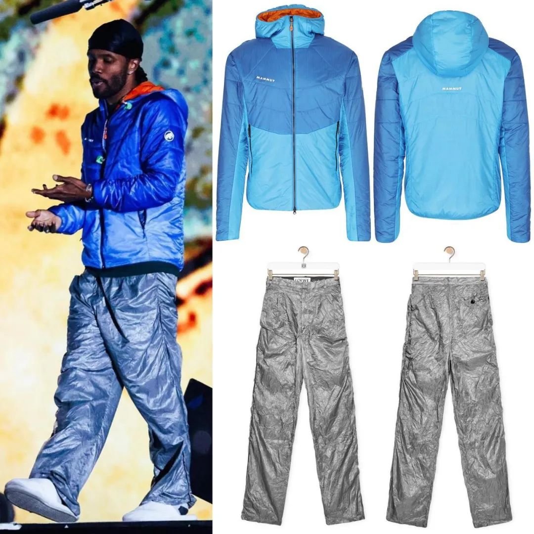 回到正题,造型方面,Frank Ocean 本次则选择蓝色 mammut 猛犸象羽绒服,搭配 loewe 银色长裤,戴上黑色 Durag 陪伴自己的演出。虽然很有可能原本安排的造型并非如此,因为有目击者见到彩排时舞者穿上定制的 Prada 羽绒服加入演出。但 Frank Ocean 一直是户外品牌的忠实拥趸,除了 mammut 外,Arc‘teryx、Fracap 等品牌会时常出现在他的 outfit 中。