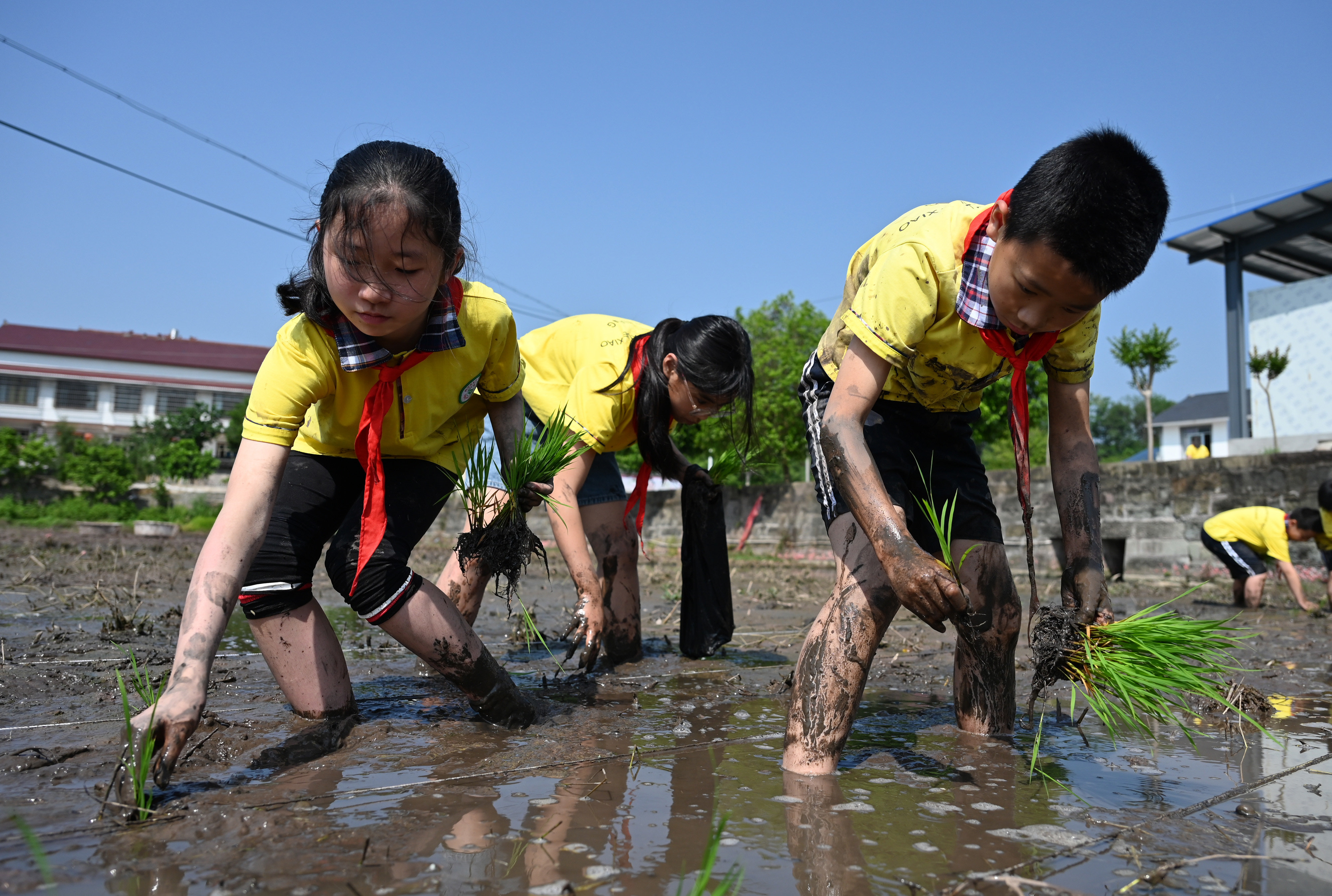 4月19日,在内江市东兴区双才镇玉皇观村,五星小学的学生学习插秧。新华社发(唐明润 摄)