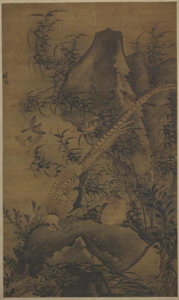 《锦鸡图》轴,明,林良绘,现藏于故宫博物院。画中主体为一对锦鸡,另有麻雀上下翻飞,布谷、斑鸠等在枝叶间栖息。