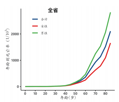 男性死亡率高于女性,分别为195.77/10万和126.81/10万,男女比例为1.54:1 。