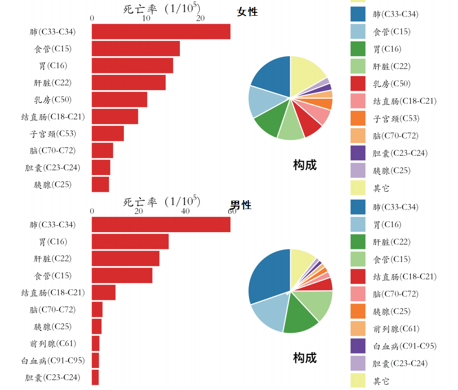 不管男性还是女性,肺癌均是导致恶性肿瘤死亡的最主要原因,肺癌死亡病例占全部死亡病例的26.43%。