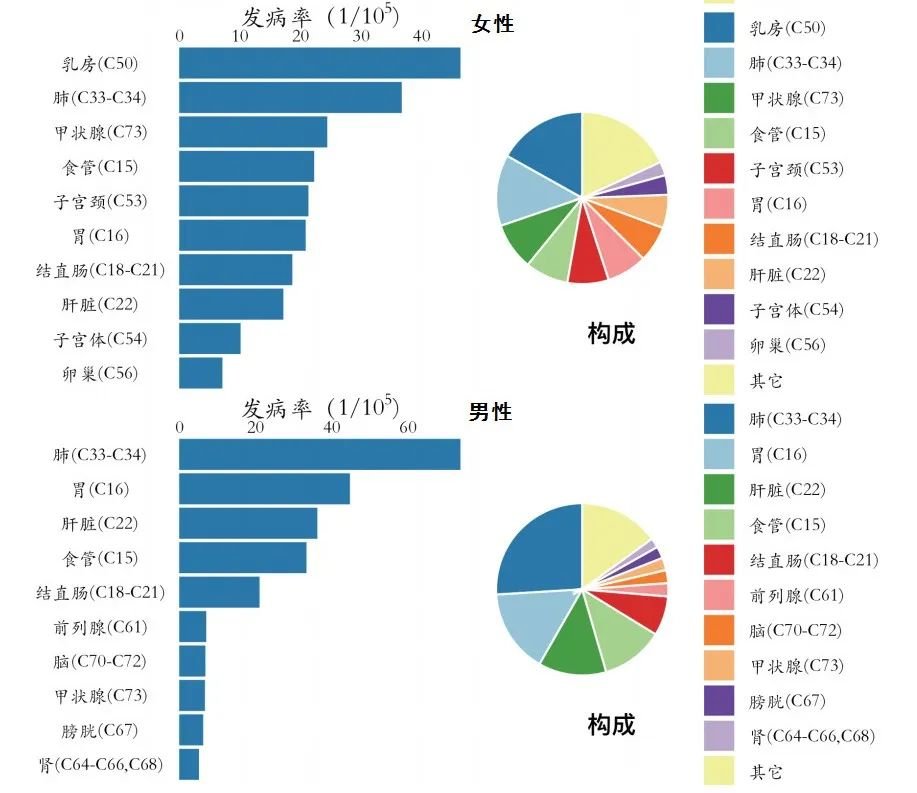 乳腺癌位居女性恶性肿瘤发病的第一位,占女性全部恶性肿瘤病例的16.88%;肺癌是男性最常见的恶性肿瘤,占男性全部恶性肿瘤病例的25.97%。